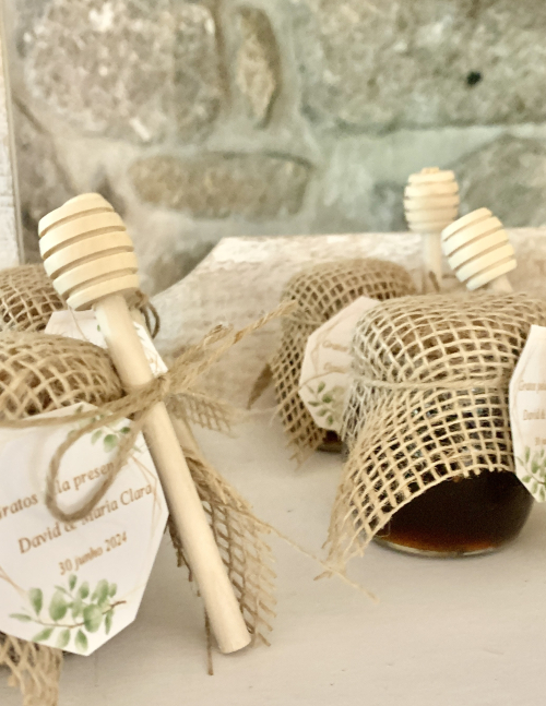 Lembrança artesanal composta por mini frasco de mel decorado com tecido de serapilheira e cordel natural, acompanhada de pau de mel em madeira. Inclui etiqueta personalizada com nomes e data. Ideal para casamentos, batizados e eventos rústicos com toque natural e doce.