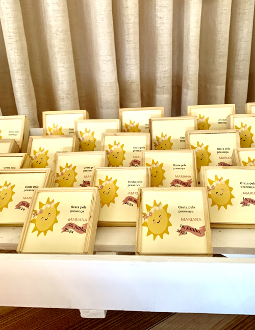 Caixinha em madeira clara com tampa personalizada com ilustração de sol e nome do evento. Inclui mensagem de agradecimento e data. Uma lembrança divertida e luminosa, perfeita para festas infantis, batizados ou aniversários personalizados.