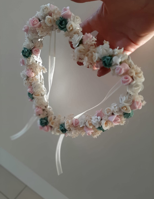 Porta alianças em formato circular, decorado manualmente com pequenas flores em tons suaves de rosa, branco e verde, criando um conjunto delicado e harmonioso. Enriquecido com fitas brancas para prender as alianças, é uma peça leve e elegante, ideal para cerimónias de casamento românticas, boho ou clássicas. Para além do momento simbólico da troca das alianças, funciona também como uma bonita recordação decorativa do grande dia.