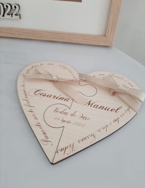 Porta alianças em madeira natural em forma de coração, com gravação a laser personalizada com os nomes dos noivos, data e mensagem especial. O design simbólico em duas metades representa a união de duas vidas, enquanto as fitas em tom neutro permitem prender as alianças de forma elegante durante a cerimónia. Uma peça intemporal, perfeita para casamentos românticos e que permanece como uma recordação única do grande dia.